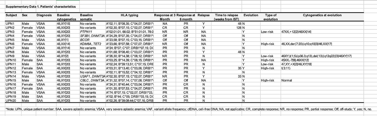 Take a moment to appreciate that since supplementary files are difficult to deal with, the information in them is usually missing in public compendia. This is a big issue! Many research questions can only be answered when this data is available. What differentiates Very Severe Aplastic Anemia from mere Severe Aplastic Anemia? Can we find a cell state that differentiates responders from non-responders? Can the baseline cytogenetics help us inform such a prediction?